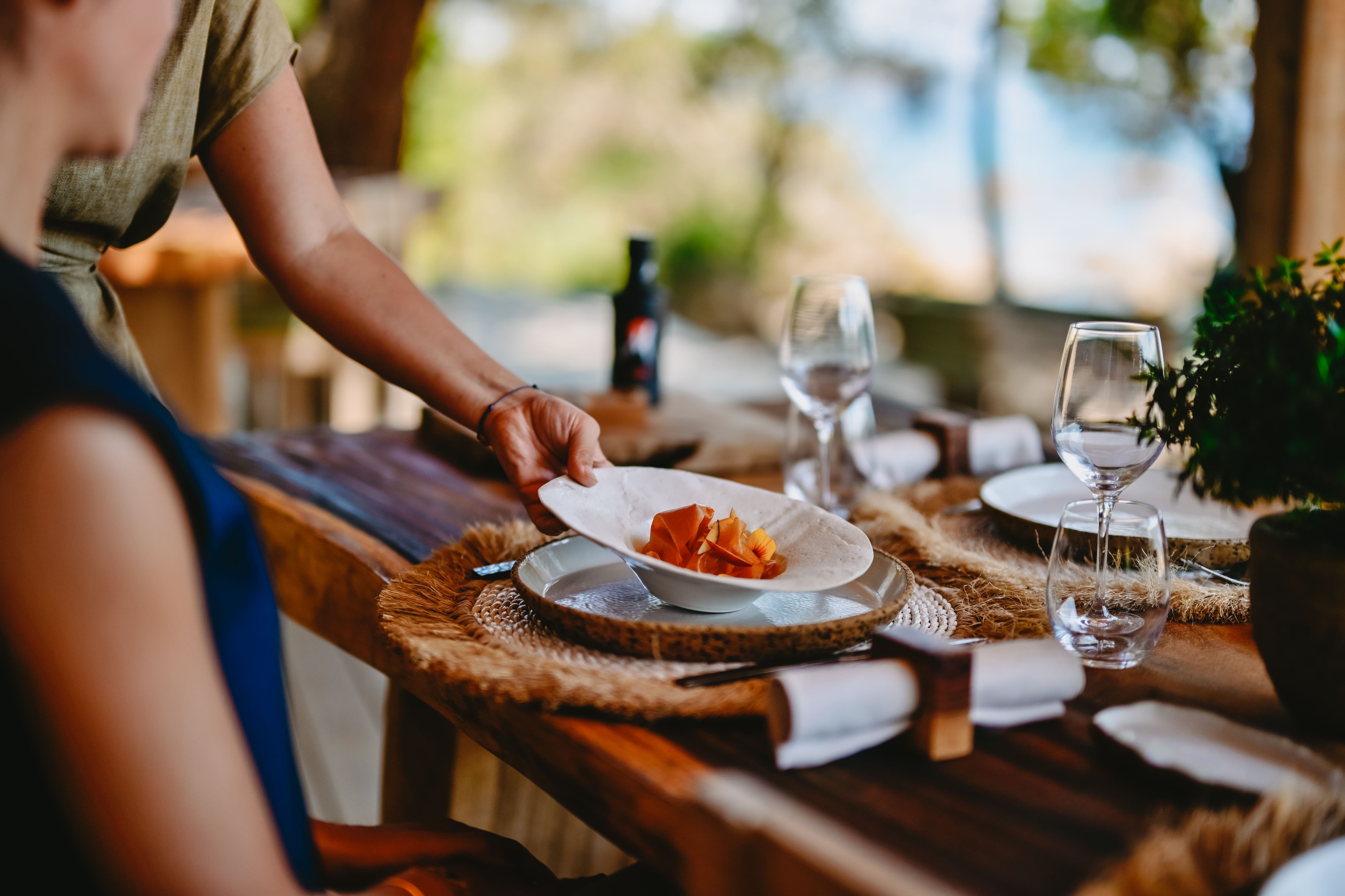 Under the shade of the pine trees ... Our beach restaurant, a real haven of peace, invites you to relax. At lunchtime, the Chef offers you a seasonal and changing "seaside" menu – fresh and exciting, all depending on the catch of the day. As a firm supporter of short supply chains, from producer to the plate, and of letting each product shine individually, he will help you to discover their natural flavours, from the most noble to the most exceptional. Fish from the gulf, authentic meats, pasta and ravioli with local flavours are sure to enchant. A precise cuisine, with zero artificial additives – a real guarantee of quality. Savour the essence of Corsica in one meal, all by the water's edge. For a desert-island-style lunch or simply to enjoy an afternoon you're sure to remember, you'll love this ideal setting for an unusual getaway. To finish off your day, discover the estate's cove down the small wooden staircases. A veritable corner of paradise – an intimate and preserved space. The surrounding lush nature, where colours and contrasts come together, will plunge you into a state of serenity and tranquility. For a day of rest and relaxation or during your stay, enjoy an unusual and unforgettable experience.